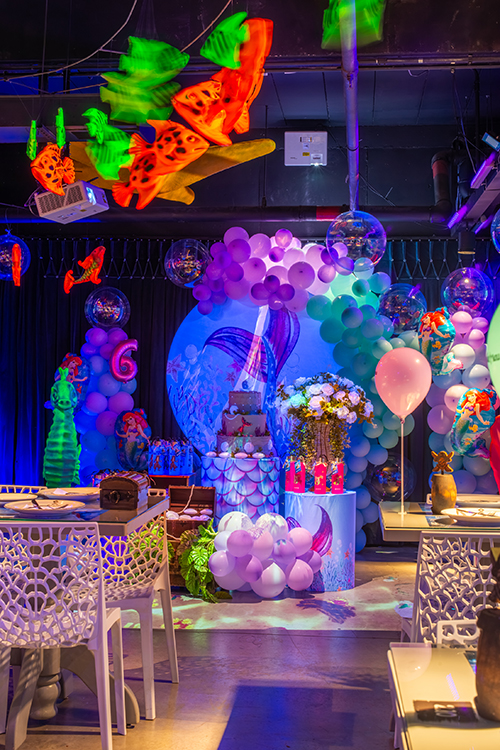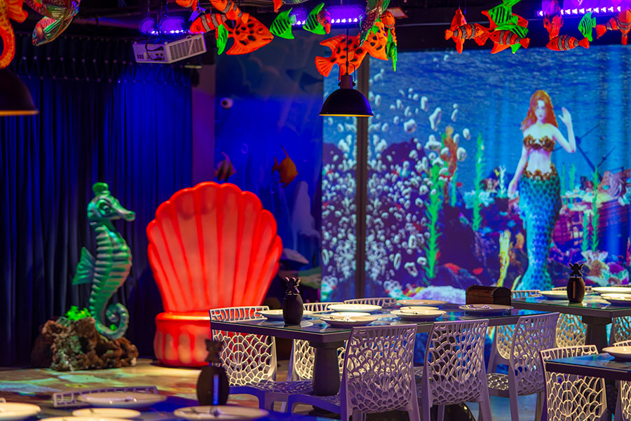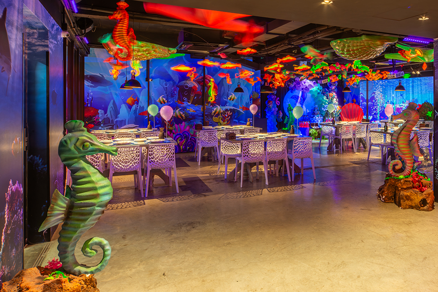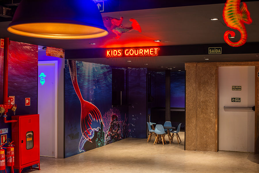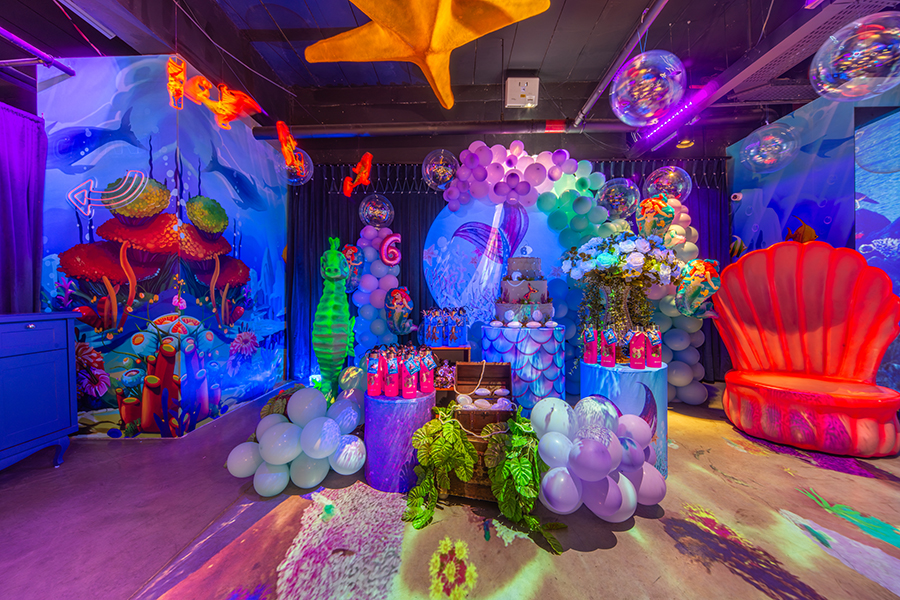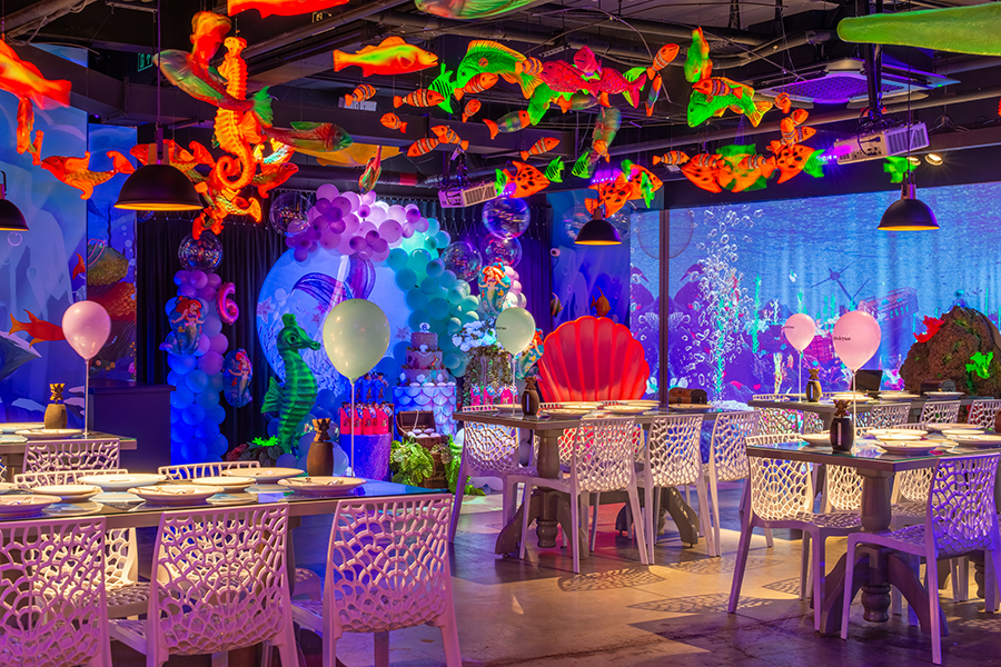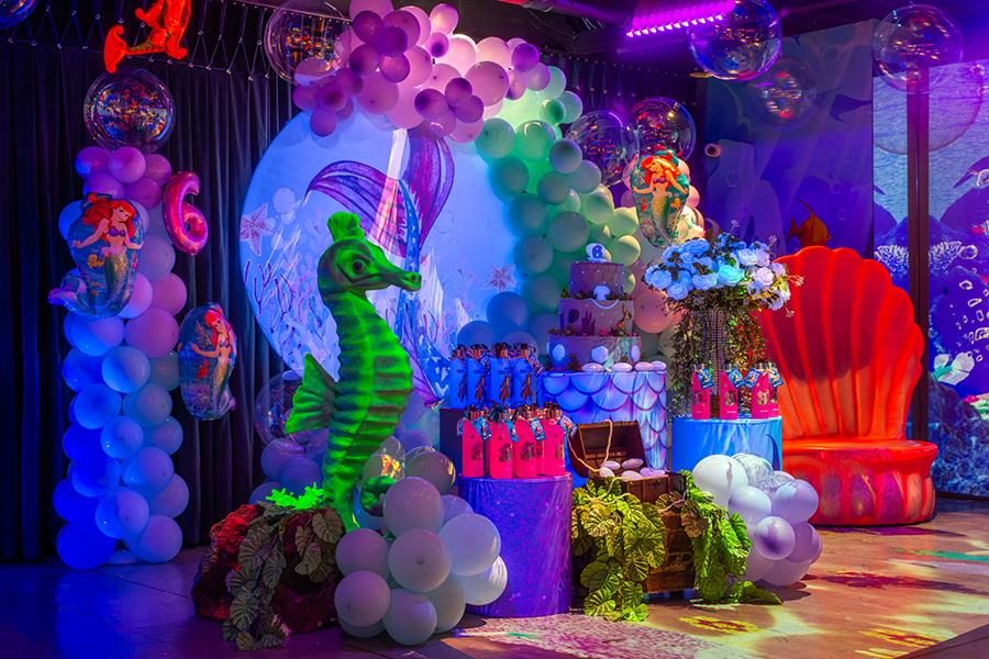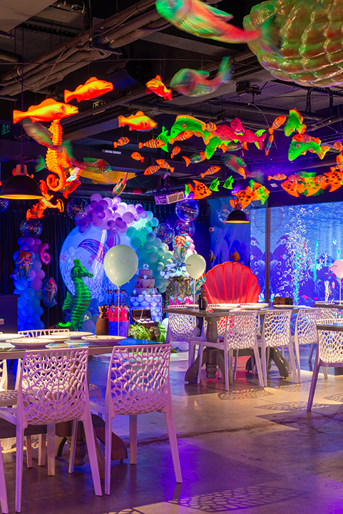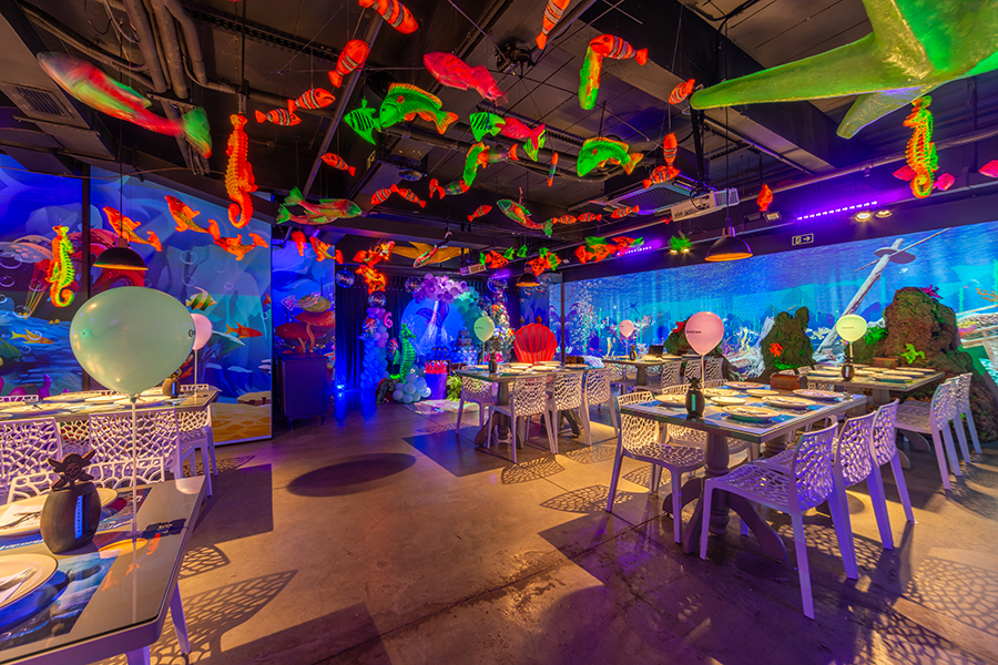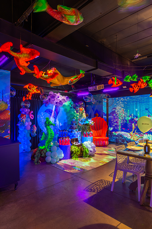 O espaço é totalmente tematizado com projeções do fundo do mar, som ambiente com suas playlists do Spotify preferidas e toda a estrutura necessária para receber seus convidados com conforto e diversão.
