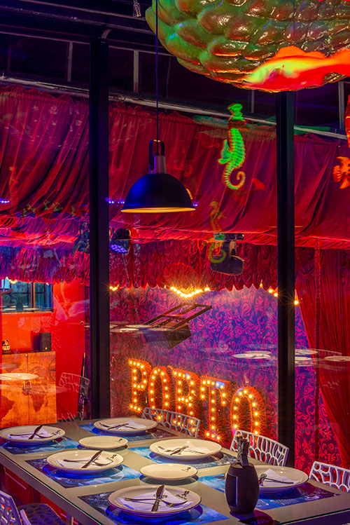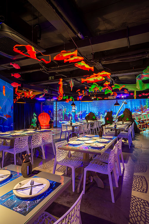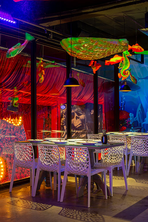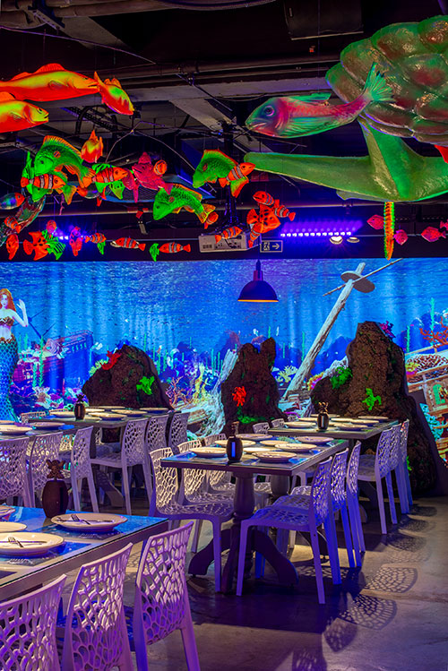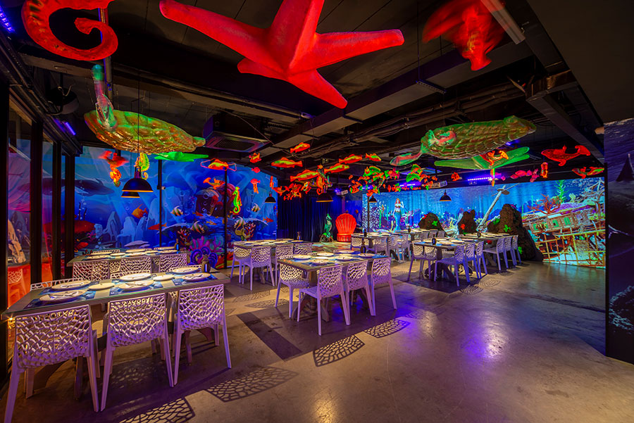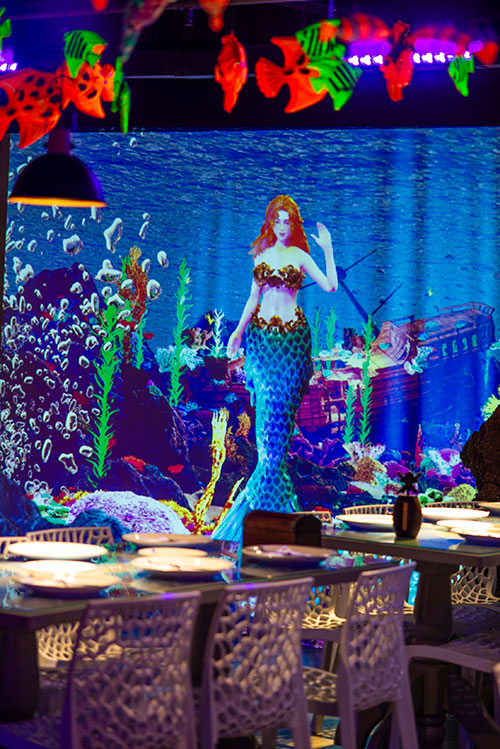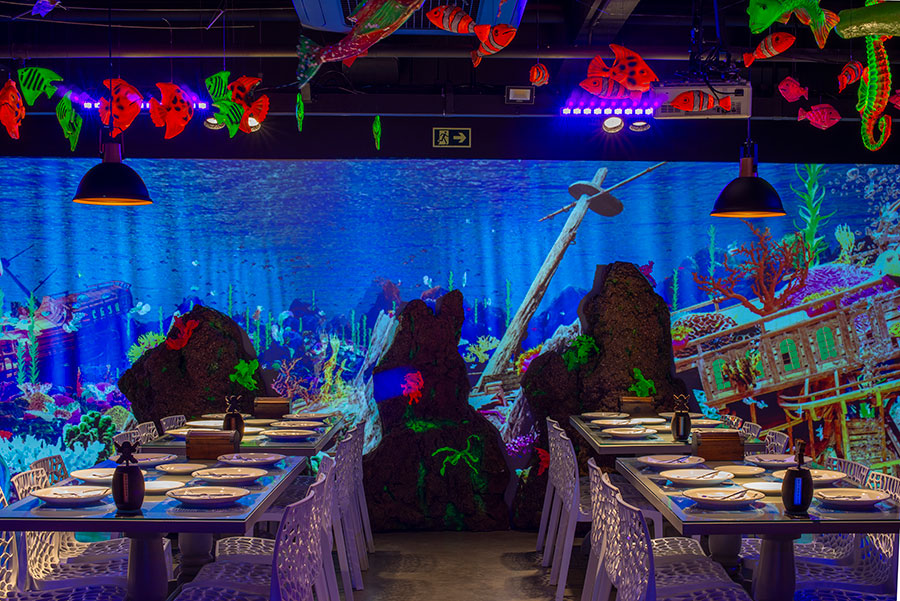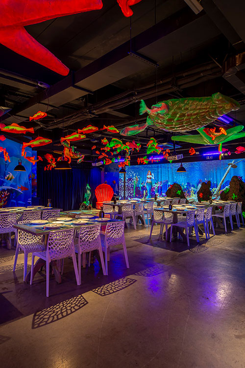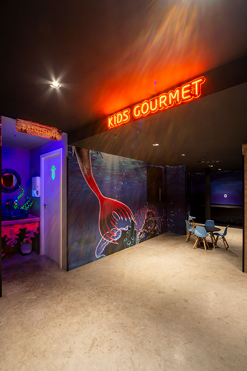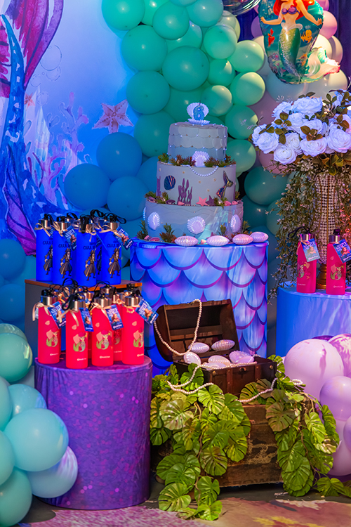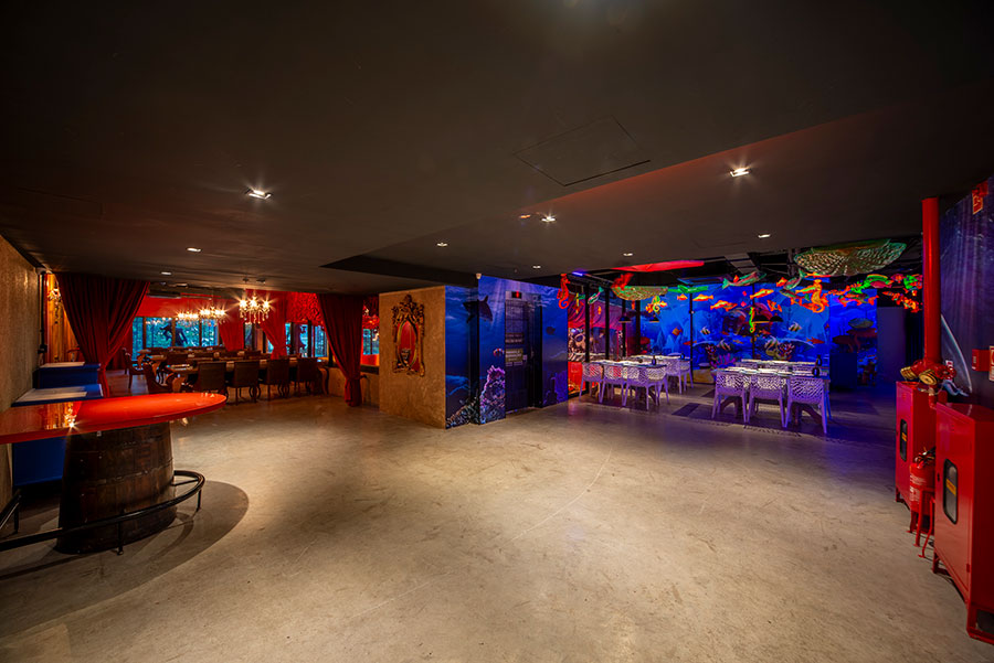 O espaço é totalmente tematizado com projeções do fundo do mar, som ambiente com suas playlists do Spotify preferidas e toda a estrutura necessária para receber seus convidados com conforto e diversão.